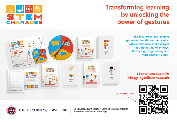 STEM Charades is informed by international research into the role of gestures in helping children and adults to communicate their understanding, particularly in STEM subjects (Science, Technology, Engineering, Mathematics). The game plays a core role in a broader initiative, supported by an accredited online training course, to communicate research with educators into Embodied Learning: the role of body-based experiences in how we think and learn and how gesture can bridge these experiences with more formal understanding and language.